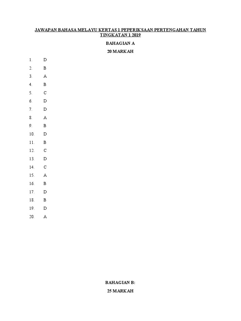 Jawapan Bahasa Melayu Kertas 1 Peperiksaan Pertengahan Tahun Tingkatan 1 2019 Pdf